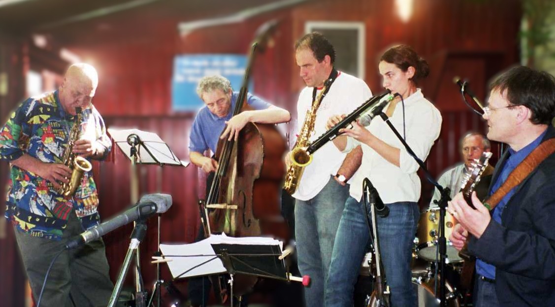 The BMacD band: L to R: Alyn Cosker, drs: George Lyle, db: Nicola MacDonald, v & melodica; George Burt, gtr; Raymond MacDonald, saxophones.